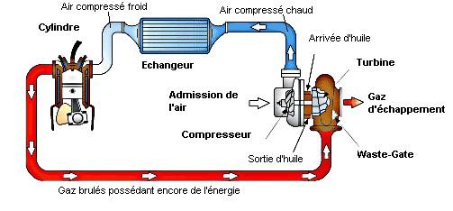 s’évacue en pur perte dans la ligne d’échappement. Schéma du principe de fonctionnement : Les gaz d'échappement passent dans une turbine d'échappement,