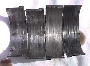 …et là, les chemises sont marquées, les bielles bleues, l’arbre à cames marqué également et les coussinets de bielle sont morts sans oublier un segment par piston cassé et les pistons dans un sale état, ceci étant du, nous pensons à une chute de pression d’huile.